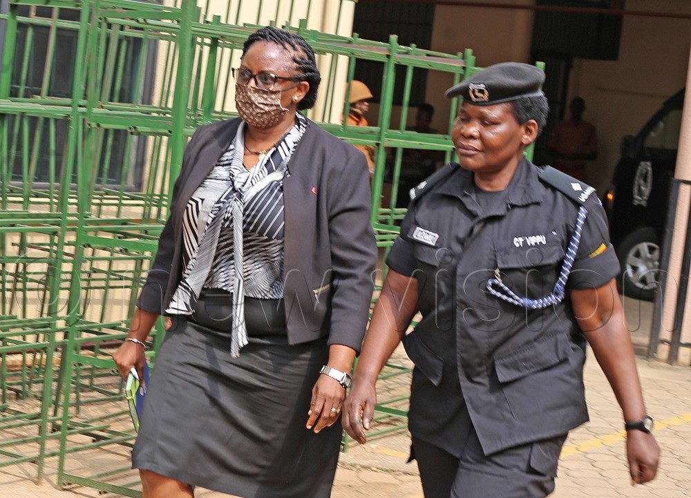 Geraldine Busuulwa Ssali, the former Permanent Secretary in the Ministry of Trade being escorted by a police officer to court recently. File photo