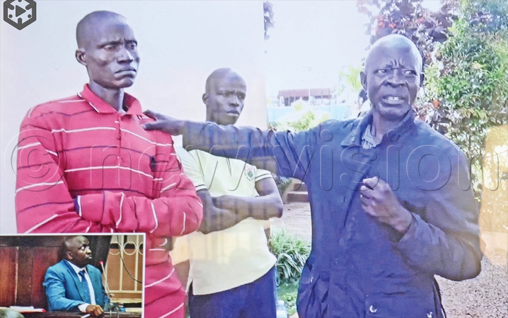 Olwo (right) identifying Kisekka (left). This was in footage captured during reconstruction of the scene at a shrine in Kitimbwa sub-county, Kayunga district. The video was played in court. (Credit: Margret Zalwango)