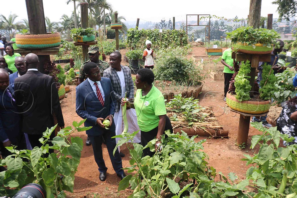 Robinah Gafabusa, a MUZARDI official explaining to the Katikkiro how the modern agriculture which emphasises vegetable growing is done./Photos by Henry Nsubuga by