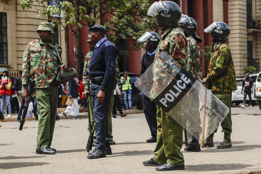(FILES) Kenya police officers gather while looking at protesters during a demonstration against tax hikes as Members of the Parliament debate the Finance Bill 2024 in downtown Nairobi, on June 18, 2024. (AFP)