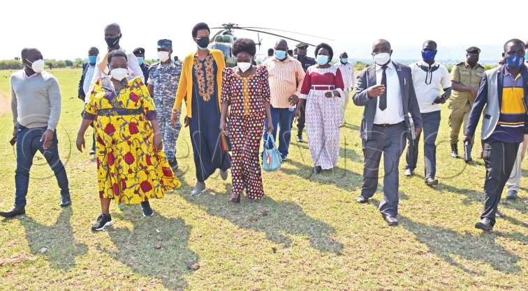 Prime Minister Robinah Nabbanja (in yellow floral dress) while in Buliisa with other officials to assess the condition of the people affected by the Lake Albert floods on Sunday.