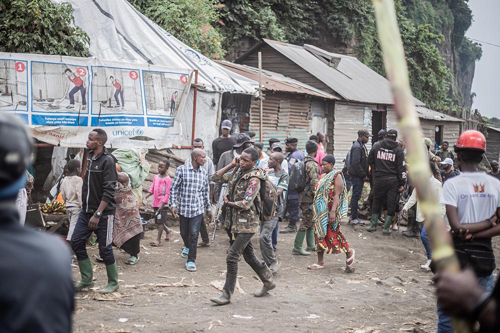 A Congolese soldier (C) walks among Congolese displaced fleeing the area of Minova near the port of Nzulo on January 21, 2025 where they will board boats to seek shelter in Goma. (Credit: AFP)