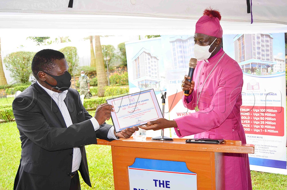 The Secretary General of the Bible Society, Simon Peter Mukhama, thanked the duo for choosing to partner with the organisation as life members.