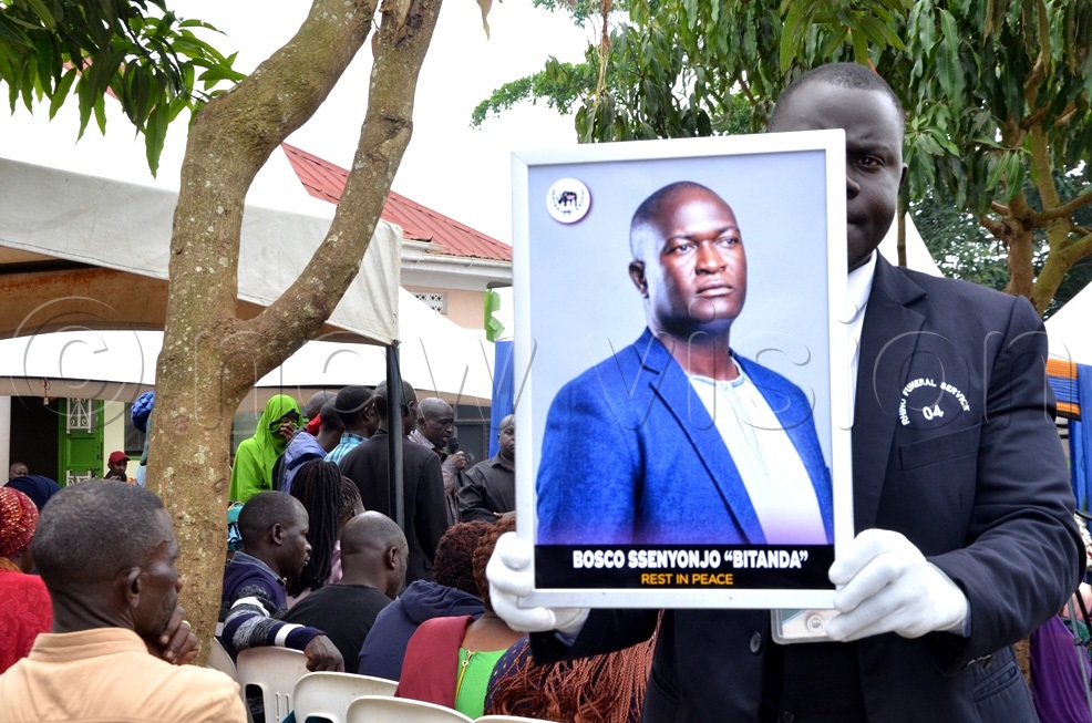 A pallbearer showing a picture of deceased John Bosco Ssenyonjo commonly known as Bitanda to mourners during his burial. (Photo by Dismus Buregyeya)