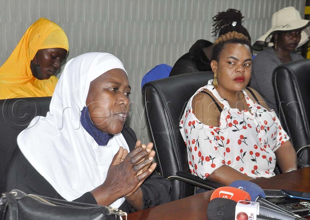 Prim Natukunda (R) a migrant worker addresses media at Hotel Africana, Kampala. Looking on is Prossy Zawedde (L), a trainer from Advanced Leadership Institute. (Credit: Godiver Assege)