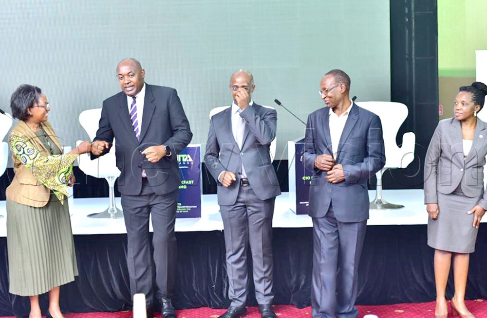 Chris Baryomunsi (2ND Left), the Minister for ICT and National Guidance interacting with the National Information and Technology Authority officials