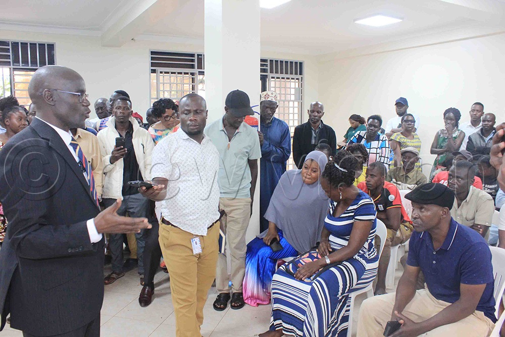 Mukono Town Clerk, Francis Byabagambi addressing the traders' representatives on Monday. (Photo by Henry Nsubuga)