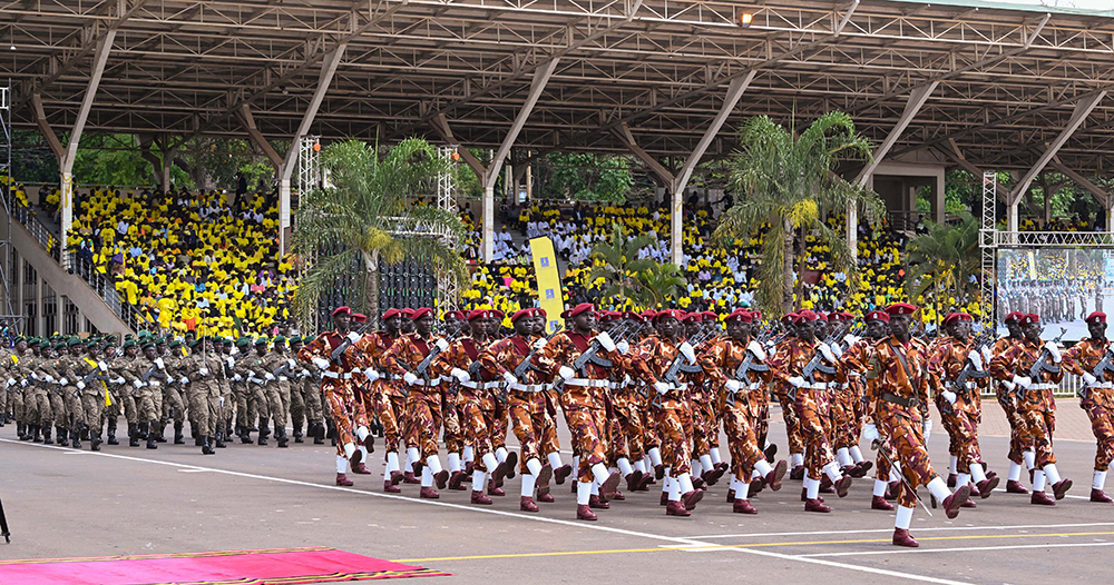 Military officers and men marching during the NRM Liberation day celebrations at Kololo on Monday. (PPU Photo)