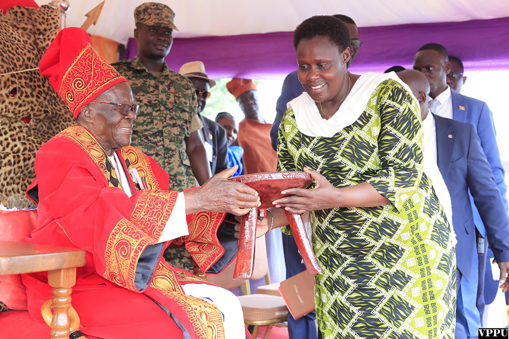 Kwar Adhola Moses Stephen Owori and Vice President Jessica Alupo exchanging pleasantries during the silver jubilee coronation anniversary celebrations. (Credit: VPPU)