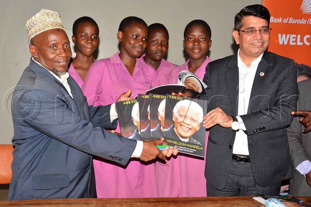 Bank of Baroda managing director Raj Kumar Meena (R) hands over copies of education books to Nabisunsa Girls students and their deputy headteacher Haji Kimera after financial literacy training.