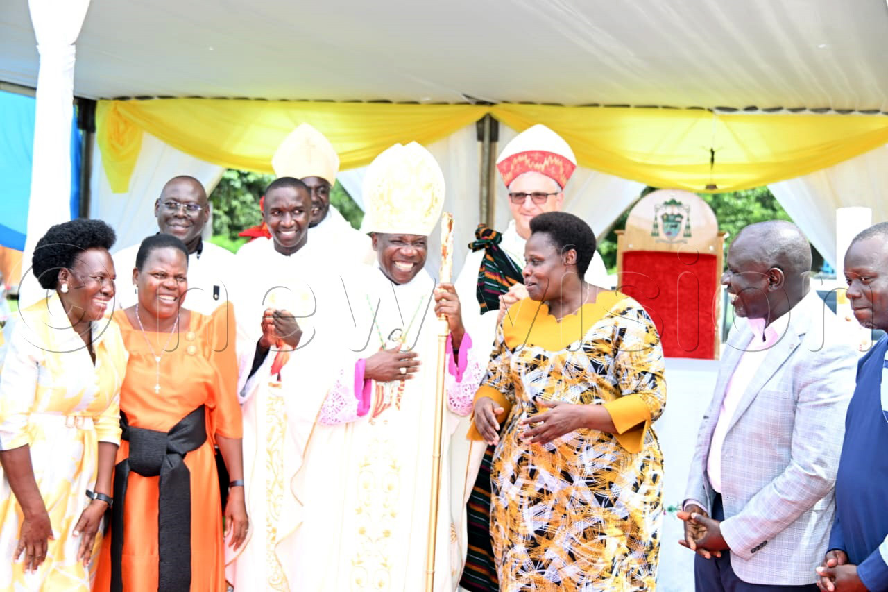 Vice President Jessica Alupo poses for a photo with prelates after the ordination of Fr. Olupot. (Credit by Delux Emmy Alomu)