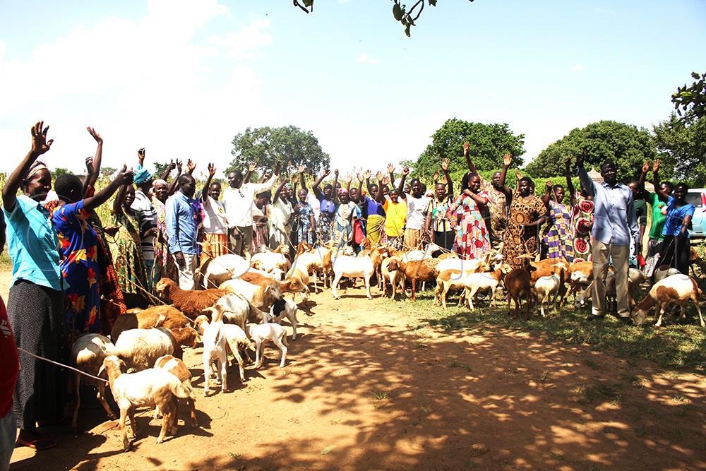 Ngariam residents raise their hands in amusement after receving goats and sheep. The residents laud minister Peter Ogwang for implementing President Museveni's poverty eradication approach at the grassroot level. (Photo By Javier Silas Omagor)