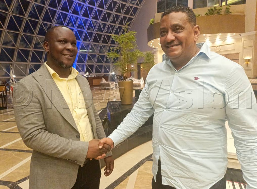 Kampala Lord Mayor candidate Moses Kizito Nsubuga and Aya Group of Companies chairperson Mohammed Hamid interact after meeting the youth. (Photo by Michael Odeng)