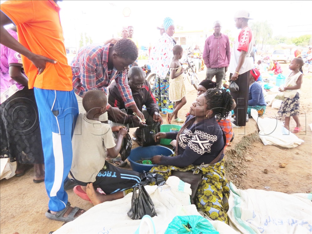 Women selling grasshoppers in Arua City. The prices of the delicacy fall to sh2000 a cup from sh5000 last week.