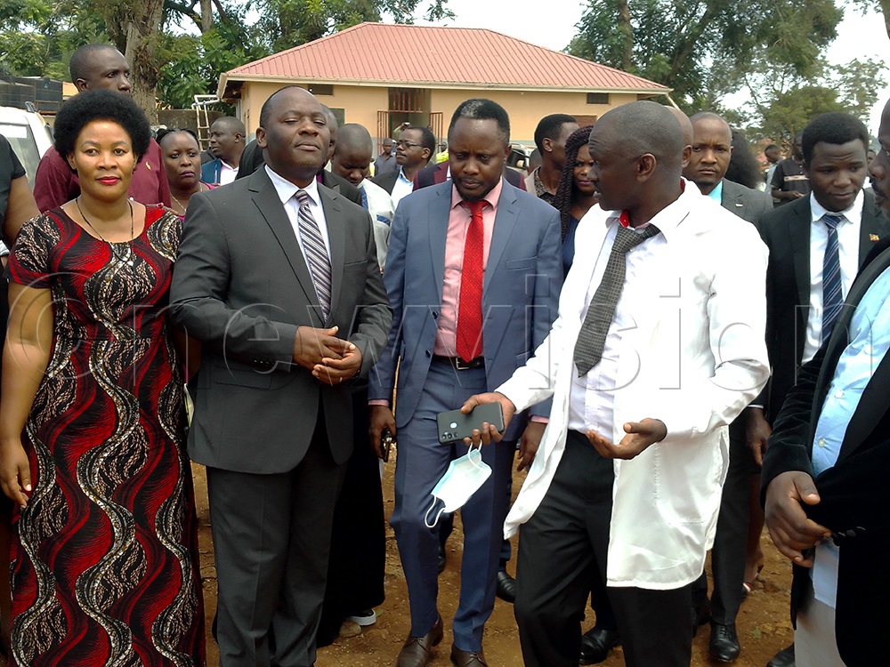 The LOP, Mathias Mpuuga, speaking to the in charge Buwama health center III, Ben Katende. (Photo by Simon Ssekidde)