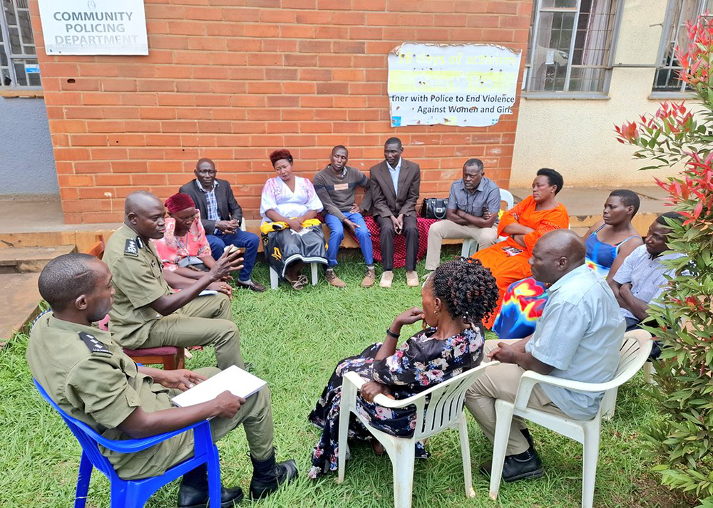 Anatoli Muleterwa, the head of the Community Policing Department, interacting with Ssemwaka’s family. (Courtes photo)