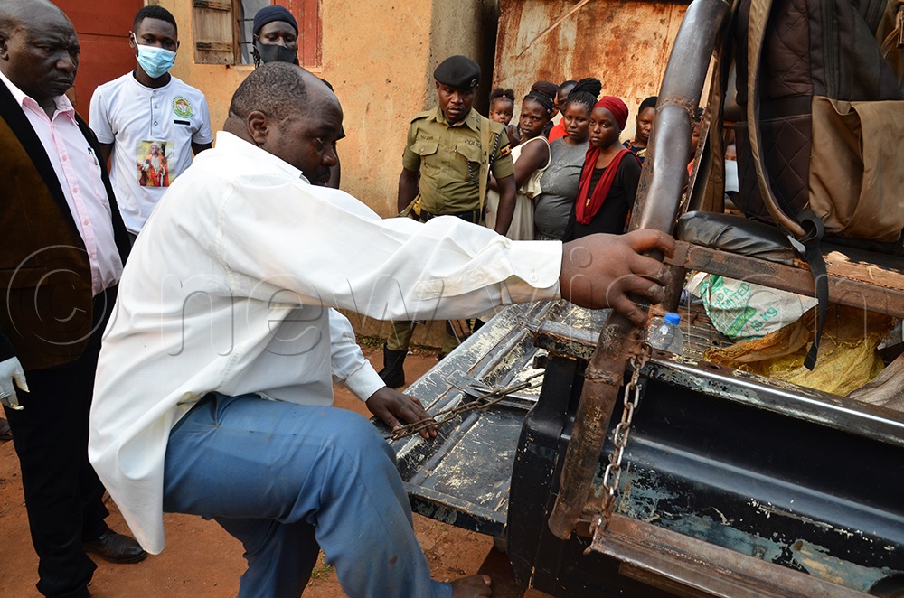 Godfrey Ddamulira being taken to Police on Monday. (Photo by Stuart Yiga)