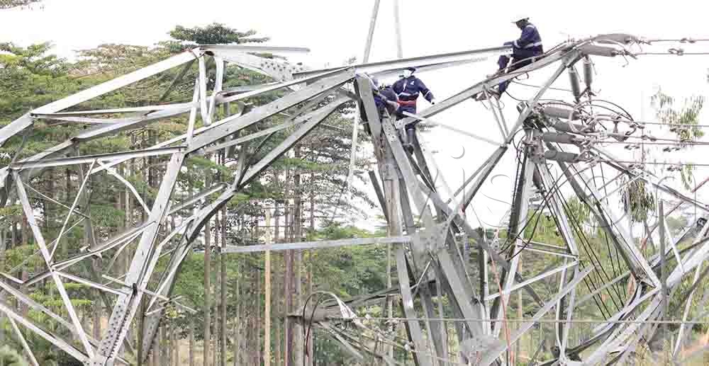 Technicians from the Electricity Regulatory Authority trying to take down the body of the vandalised structure. The Government has put the cost of replacing each vandalised pylon at $100,000 (sh375m). (Credit: Henry Nsubuga)