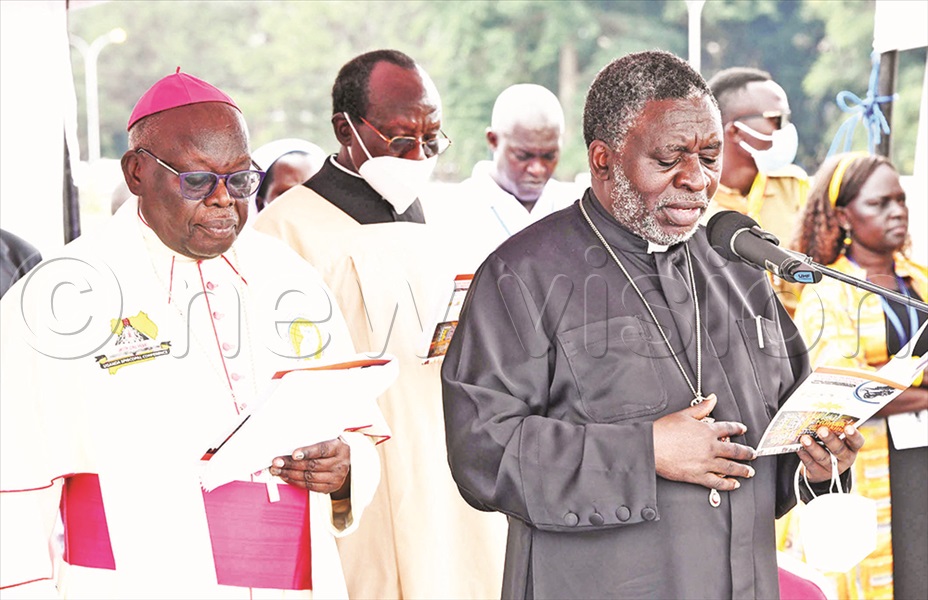 John Baptist Odama (left) and Fr. Constantine Mbonabingi during prayers on human trafficking at Kololo Independence Grounds. Mpalanyi Ssentongo
