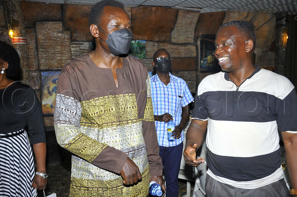 Former Managing Director New Vision Ben Opolot (L) talks to Micheal Ssebowa (R) News Editor Bukedde after a farewell luncheon for Opolot in Kampala. (Credit: Wilfred Sanya)