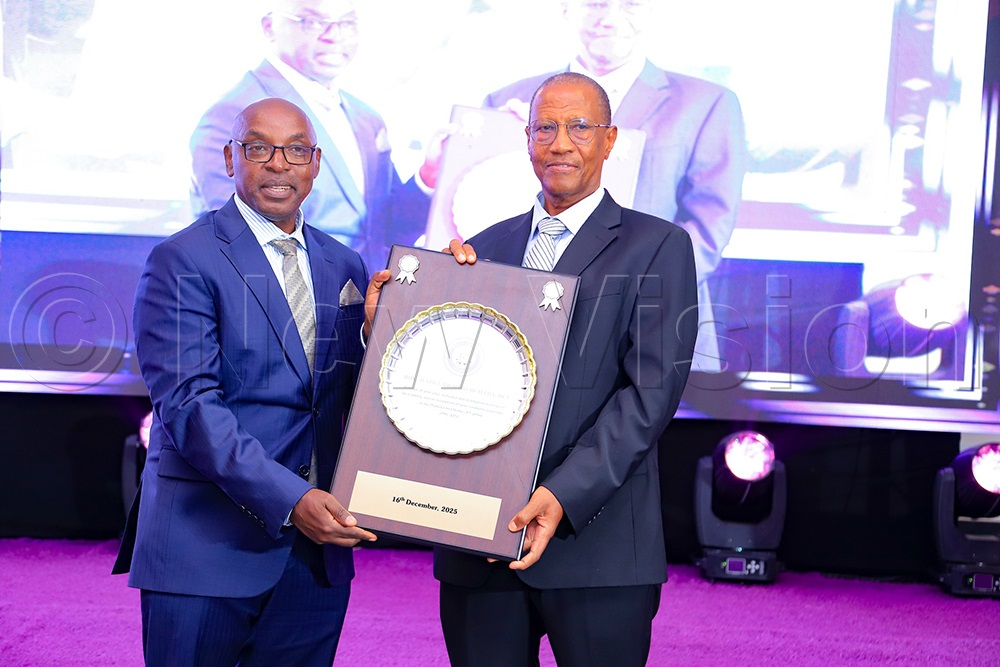 Pius Bigirimana, the judiciary PS, handing over a certificate of recognition to a retiring judiciary support staffer at the Supreme Court conference hall on Tuesday, December 16, 2025. (Photo by Farooq Kasule)