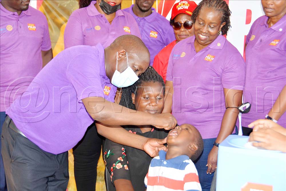 The District governor 9214 Peace Taremwa (left) admisters polio vaccine to a five-year old boy as rotary members look on during at International Hospital Kampala. (Photo by Francis Emorut