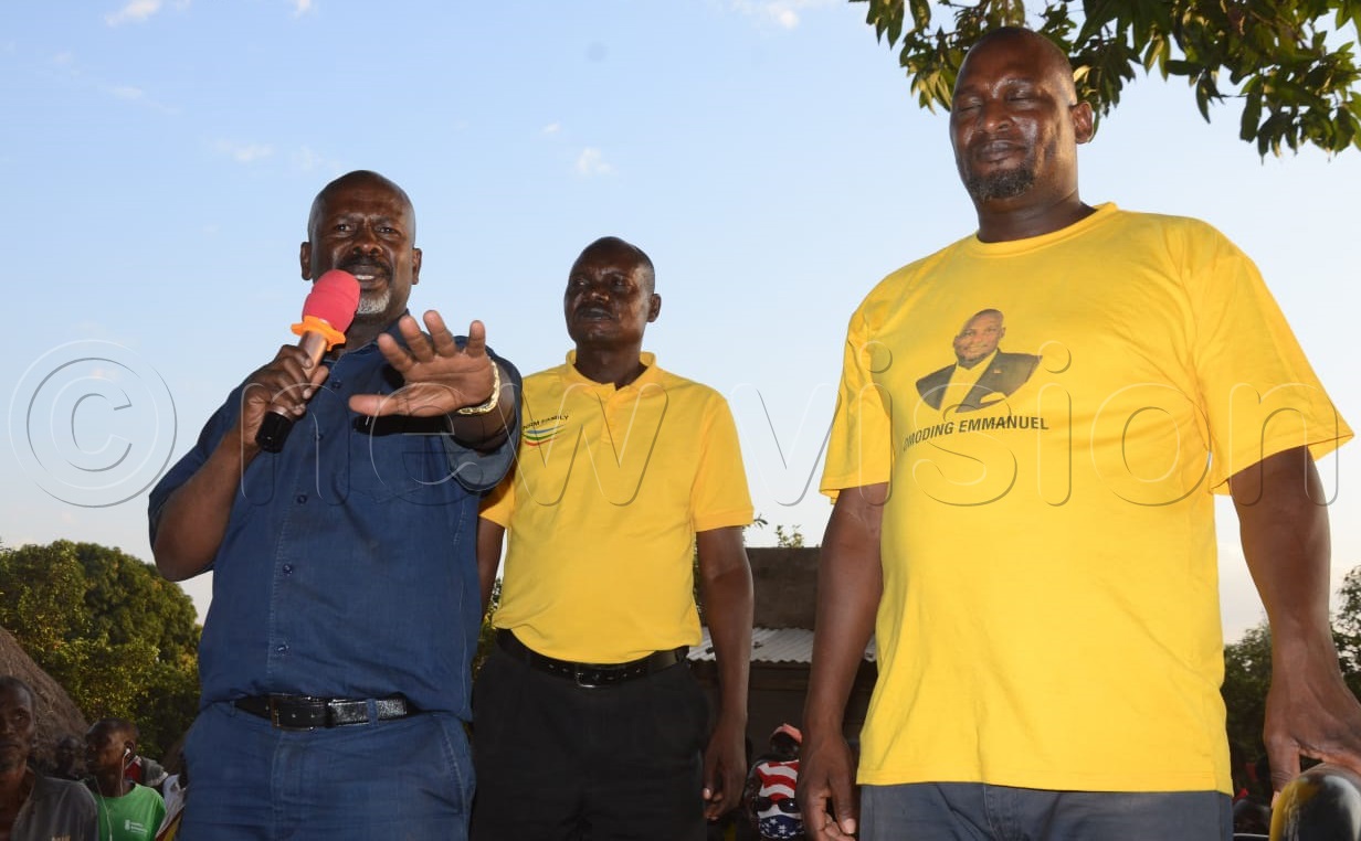MP Elijah Okupa addressing supporters of Emmanuel Omoding in Kyere sub-county on Sunday. Photo by Colleb Mugume