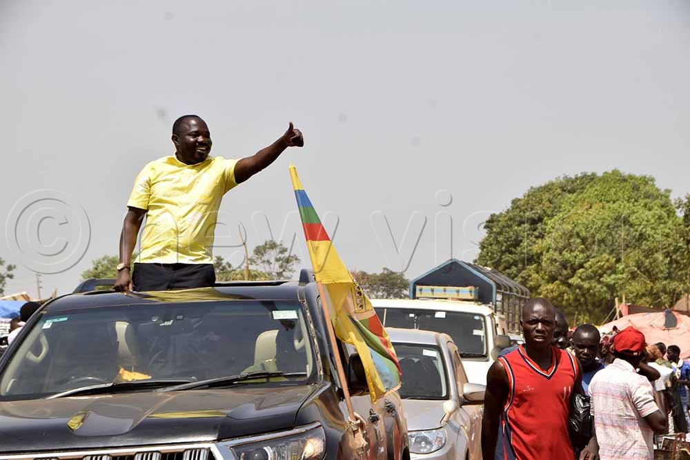 NRM's Philp Oucor of Serere County Parliamentary seat campaigning on top of his car in Kateta sub county on February 15, 2023. (Credit: Simon Peter Tumwine)