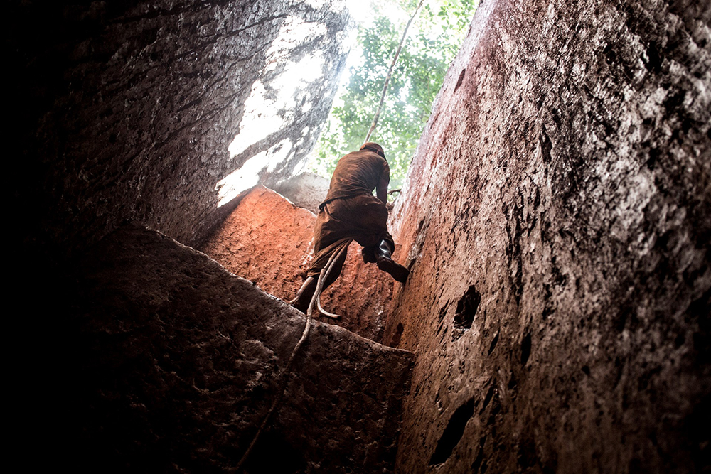 An artisanal miner climbs out of a deep gold mine in Mabakulu, Ituri Province. Local police said the area targeted was home to major gold-mining activity and a Chinese-run mine. (AFP Photo)