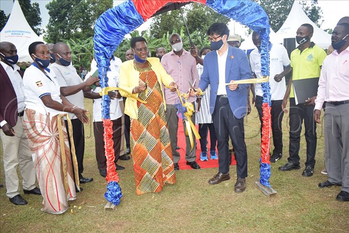 RDC Byabashaija and Heasoung Park, cutting the tape wire to mark the launch of KOICA activities aimed at promoting clean water in Bongole Parish. Photos by Prossy Nandudu