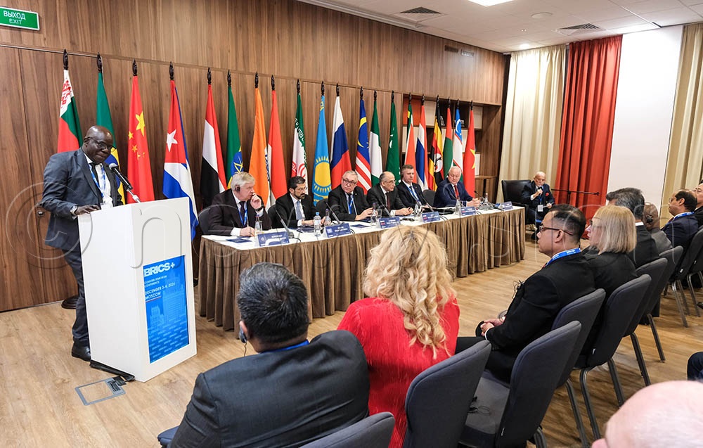 Uganda’s Stephen Chwinya, also the Director Counter-Terrorism at the Internal Security Organisation (ISO), speaking during the BRICS+ Counter-terrorism conference in Moscow, on December 3, 2025. (Credit: Hajarah Nalwadda)