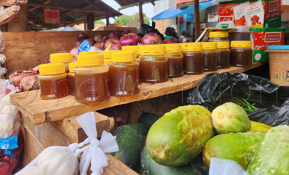 Samples of honey and other vegetables being sold in Seeta Central Market Mukono district. This was on March 3, 2025. (Credit: Lawrence Mulondo)