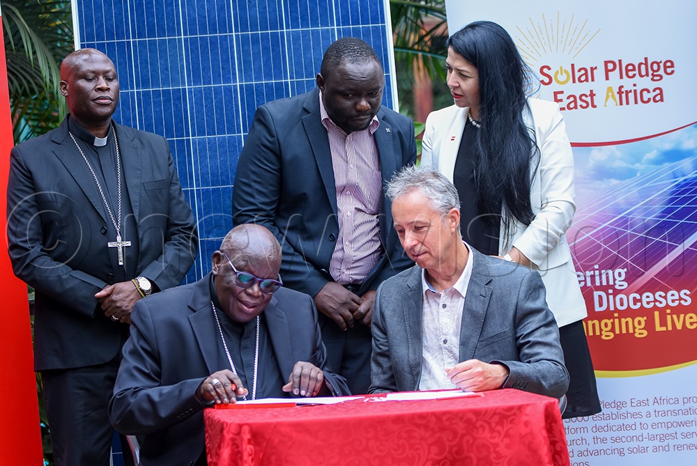 Archbishop Odama singns an MOU as Erwin Eder, the managing director HORIZONT3000 looks on and other officials including Bishop Jonny Mbubi of the Catholic Diocese of Ladwor in Turkana. (Nelson Kiva)