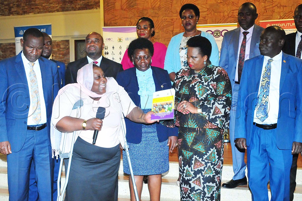 Sofia Juuko (L) Equal Opportunities Commission Chairperson speaks as Sarah Opendi Woman MP for Tororo and Betty Amongi Minister of Gender Labour and Social Development look on. Photo by Nicholas Oneal