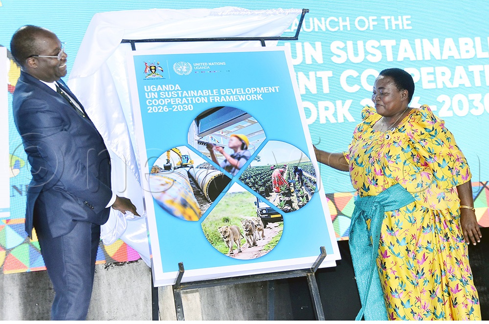 The UN Resident Coordinator in Uganda, Leonard Zulu (left) and Prime Minister Robinah Nabbanja launch the UN-Uganda sustainable development cooperation framework 2026 to 2030 at Kololo Independence Grounds in Kampala. (Photo by Ronnie Kijjambu)