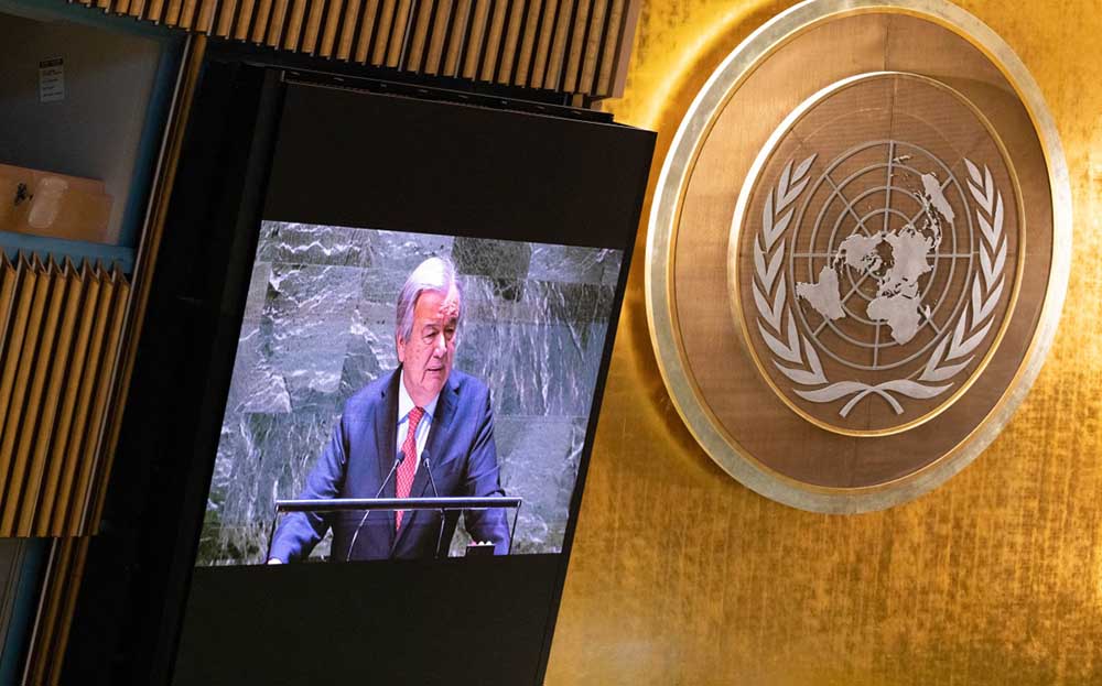 UN Secretary-General Antonio Guterres speaks at the General Assembly to present priorities for 2024 at UN headquarters in New York on February 7, 2024. Guterres warned that the world is entering "an age of chaos" with a deeply divided Security Council unable to address critical issues such as the Israel-Hamas war. (Credit: AFP)