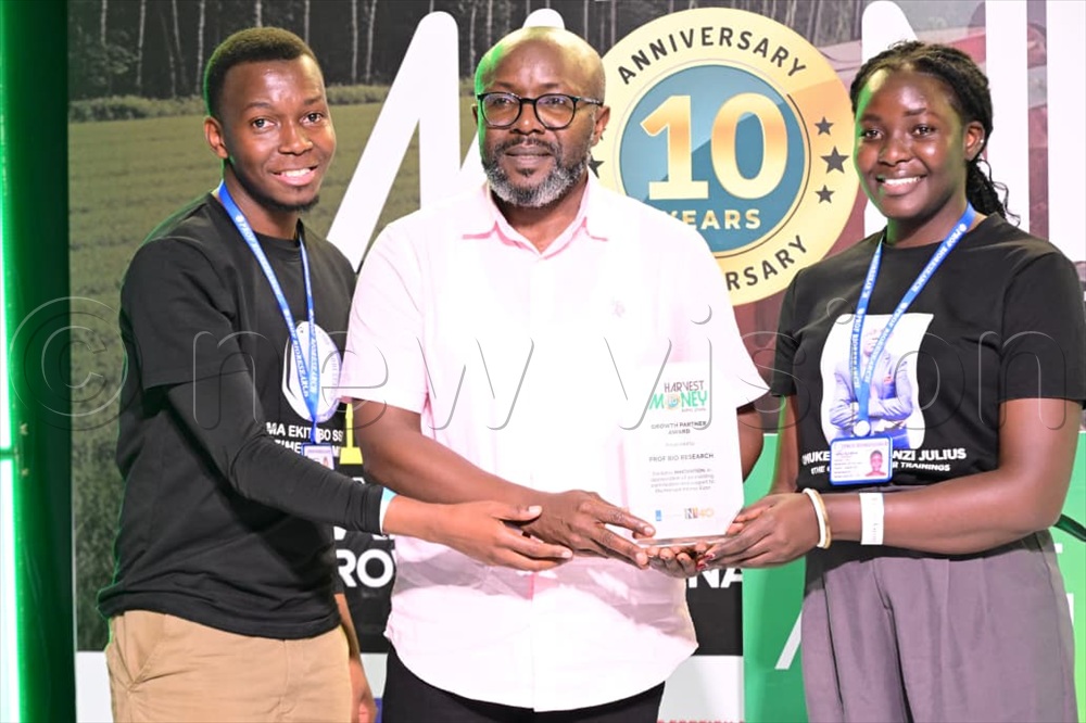 Vision Group Chief Executive Don Wanyam awarding an exhibitor at expo on Saturday, February 28, 2026. (Photos by Miriam Namutebi)