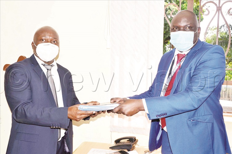 Bukenya (right) handing over the instruments of office to Byamukama at Wakiso district headquarters recently. Photo by Job Nantakiika