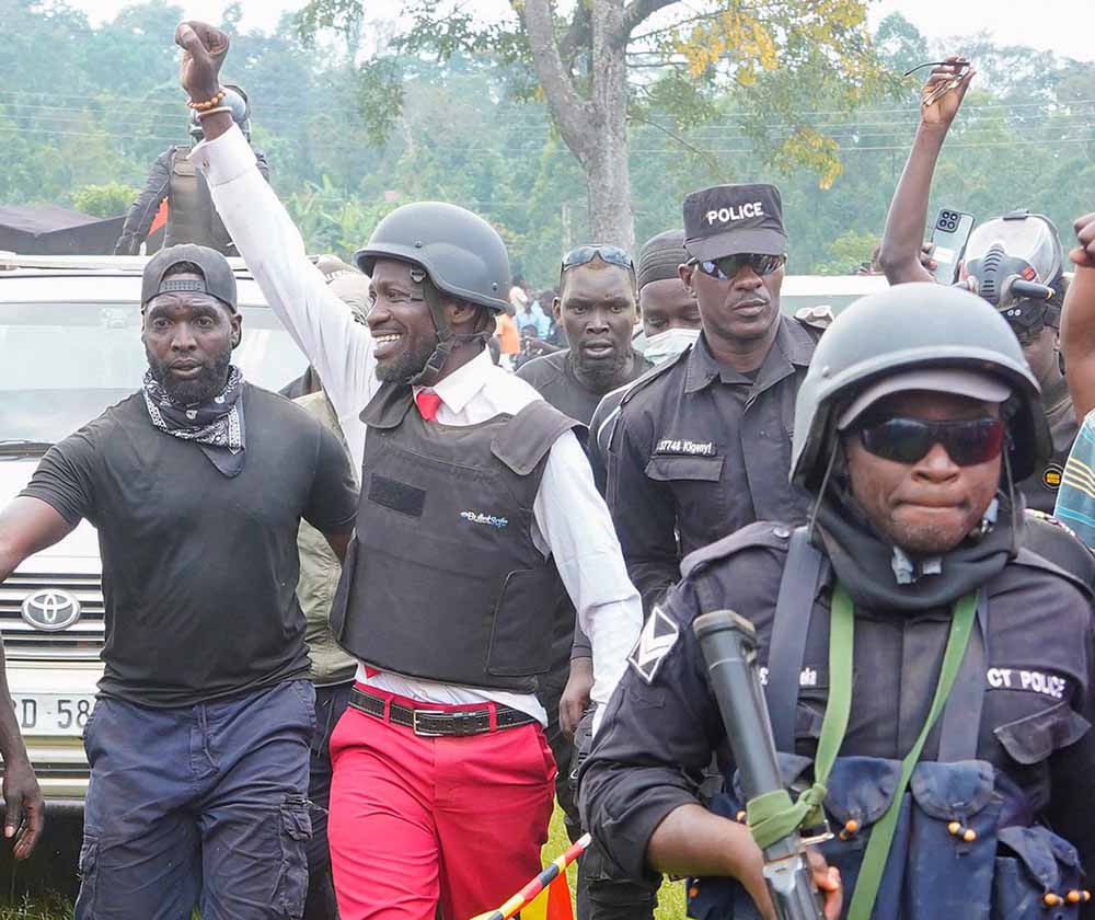 Pictured are some of the police guards (L) according security to the then presidential candidate Robert Kyagulanyi Ssentamu of the National Unity Platform at one of his campaign rallies. Kyagulanyi has since lost the elction to NRM's President Yoweri Museveni, who secured 7,946,772 (71.6%). (Credit: X/@HEBobiwine)
