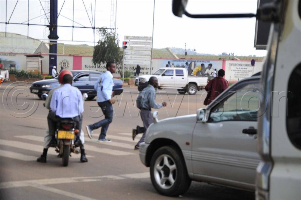 Pedestrains competing with motro bikes and vechiles to cross the road on a zebra crossing in Kampala. Photos by Victoria Nampala