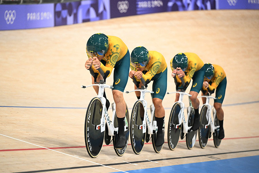 Australia compete in the men's track cycling team pursuit final for gold of the Paris 2024 Olympic Games. AFP PHOTO