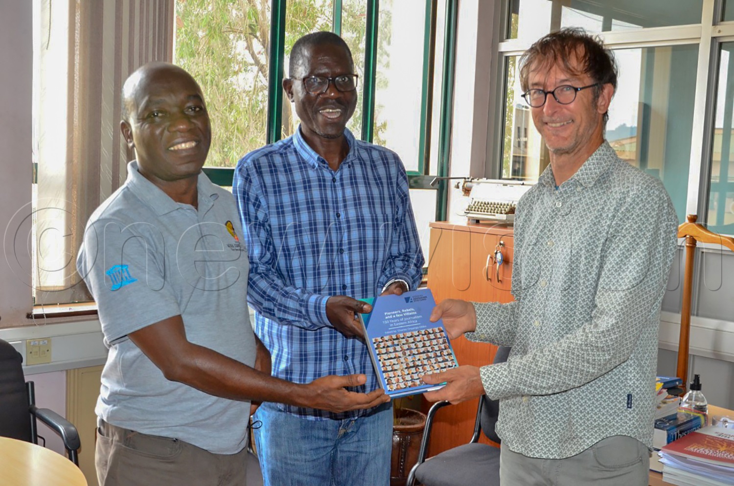 Prof. Philip Verwimp handing a copy of a book on journalism in eastern Africa to Vision Group's Felix Osike (centre) and David Mukholi (left) at Vision Group head office. (Credit: Shamim Saad)