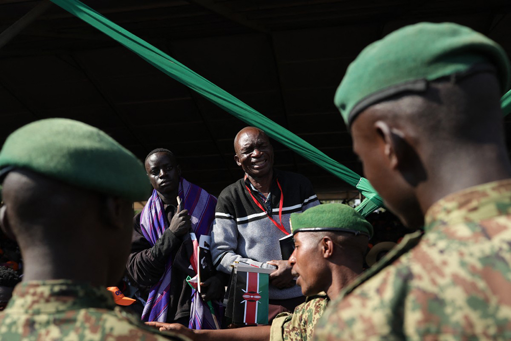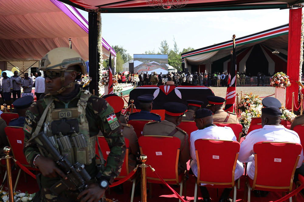 A Kenya soldier in ceremonial uniform stands next to the coffin duning the ceremony during the final day of funeral proceedings for Kenya’s opposition leader and former Prime Minister Raila Odinga at the Jaramogi Oginga Odinga University grounds in Bondo, on October 19, 2025.
