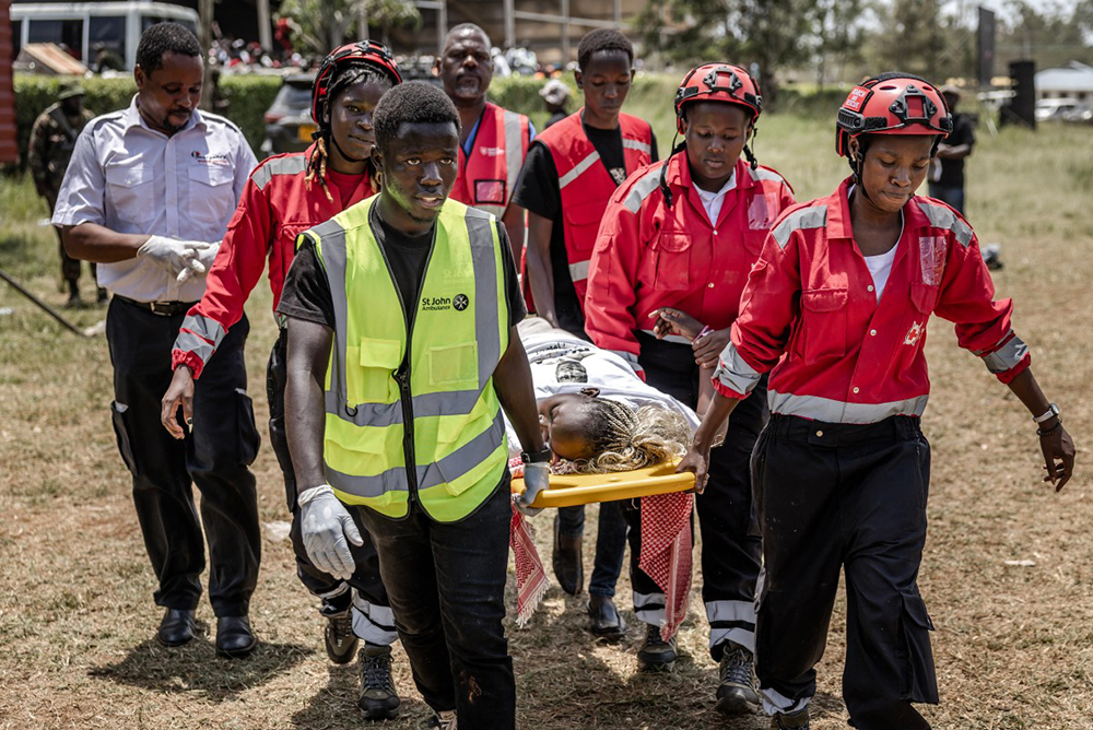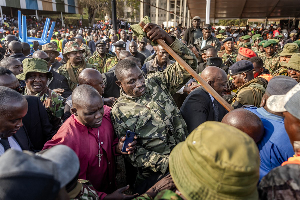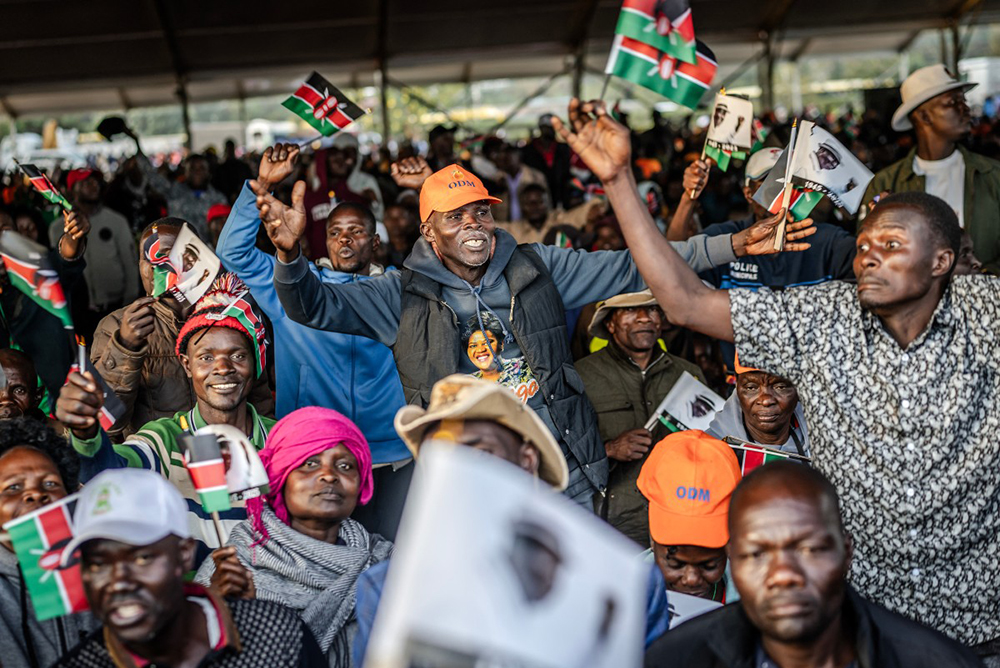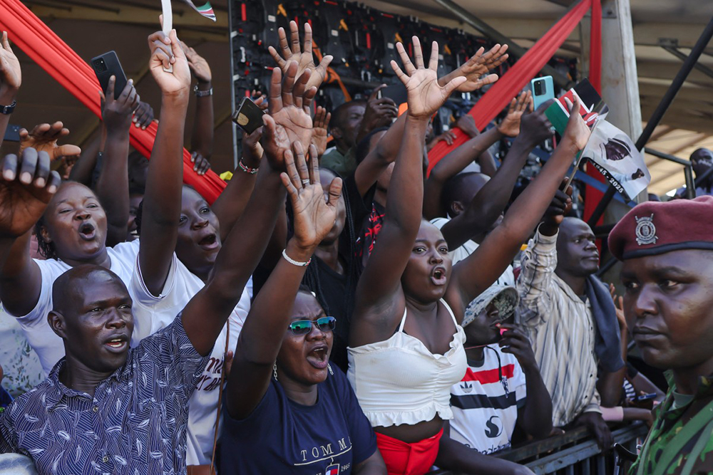 Mourners react as the body of Kenya's opposition leader and former Prime Minister, Raila Odinga leaves for his burial site during the final day of funeral proceedings at the Jaramogi Oginga Odinga University grounds in Bondo, on October 19, 2025.