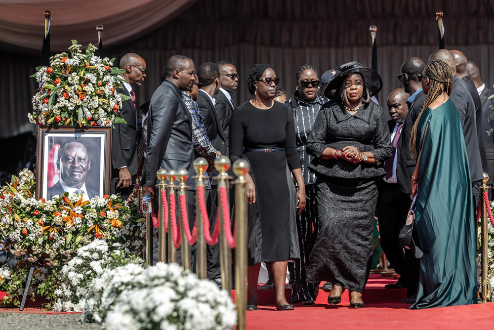 The family of Kenya’s opposition leader and former Prime Minister Raila Odinga led by Raila Junior Odinga (2L), Ida Odinga (3L), Rosemary Odinga (C) and Winnie Odinga (2R) arrive at the ceremony during the final day of funeral proceedings for Odinga at the Jaramogi Oginga Odinga University grounds in Bondo, on October 19, 2025.