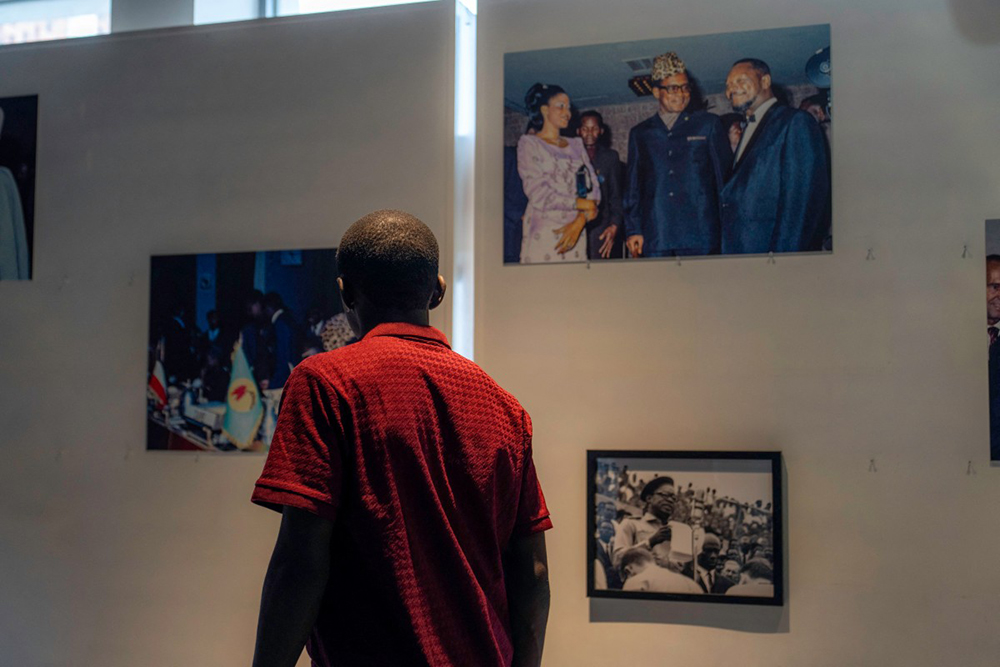 A visitor looks at photos from the exhibition ‘Mobutu, a life, a destiny’ at the National Museum in Kinshasa, on October 17, 2025.