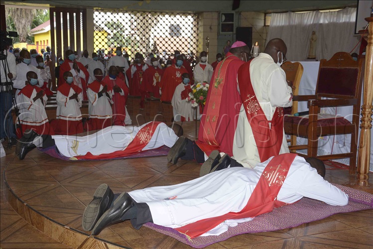The two priests that were ordained prostrating during the recitation of the litany of the saints. Photos byMathias Mazinga
