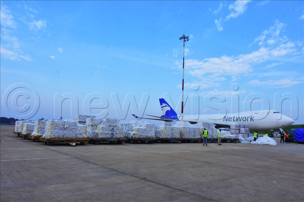 A total of 247 pallets containing ballot papers for district chairpersons, city mayors and women councillors at the district and city levels were received on Sunday (January 4) at Entebbe International Airport.