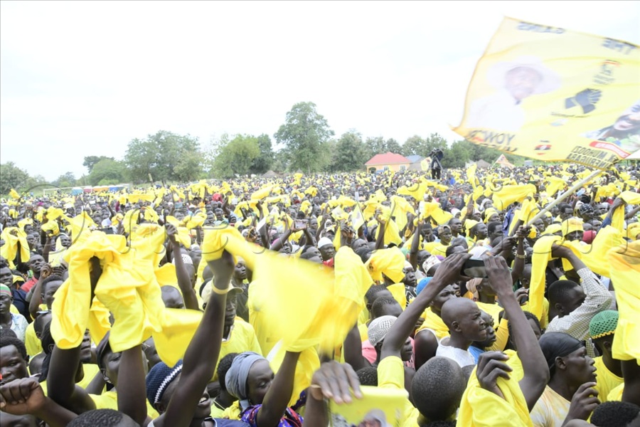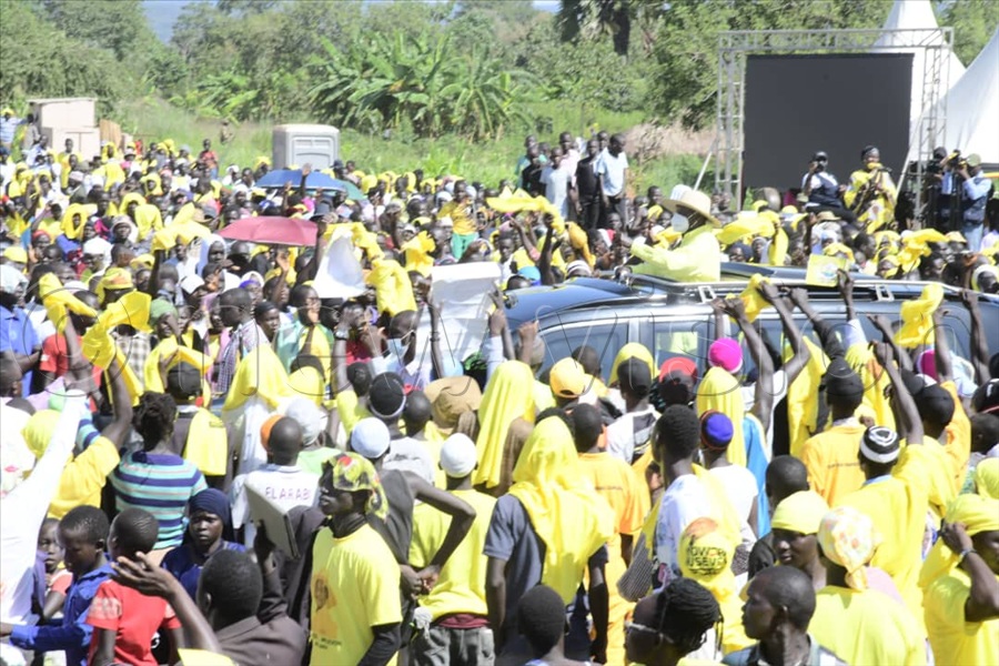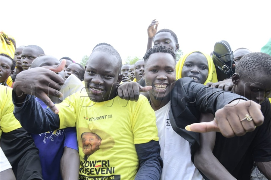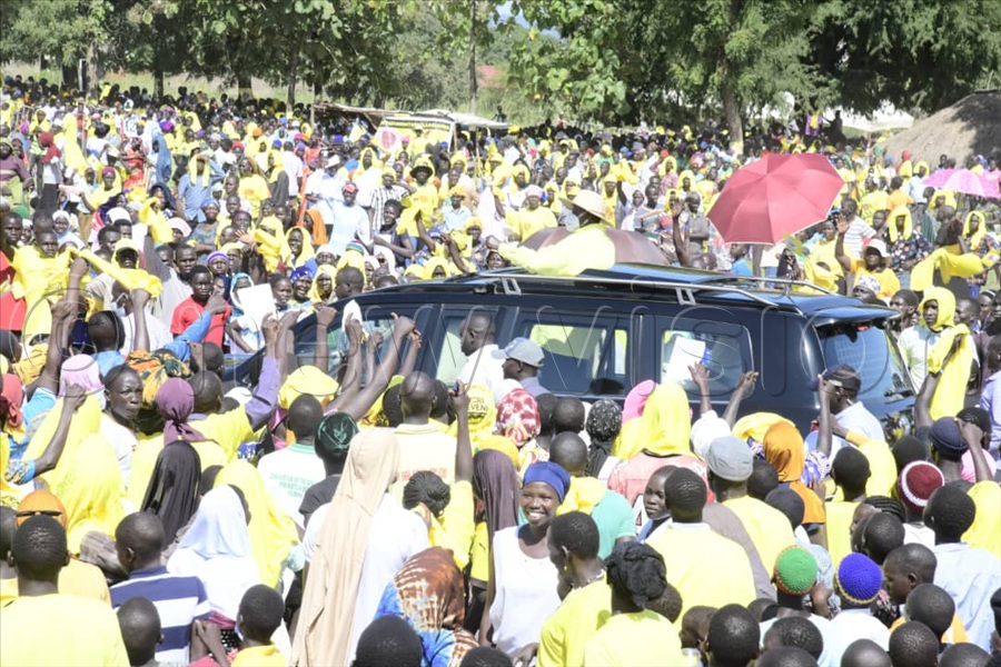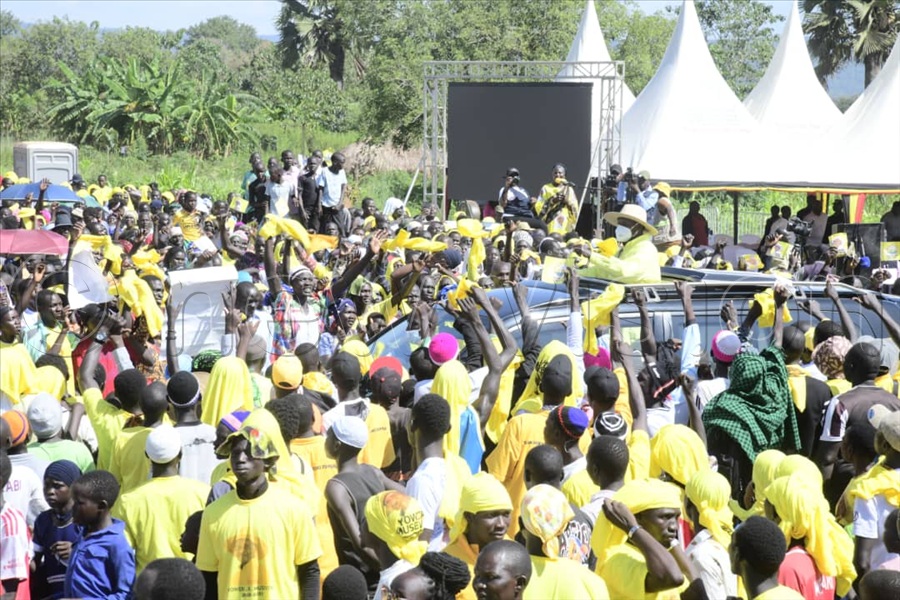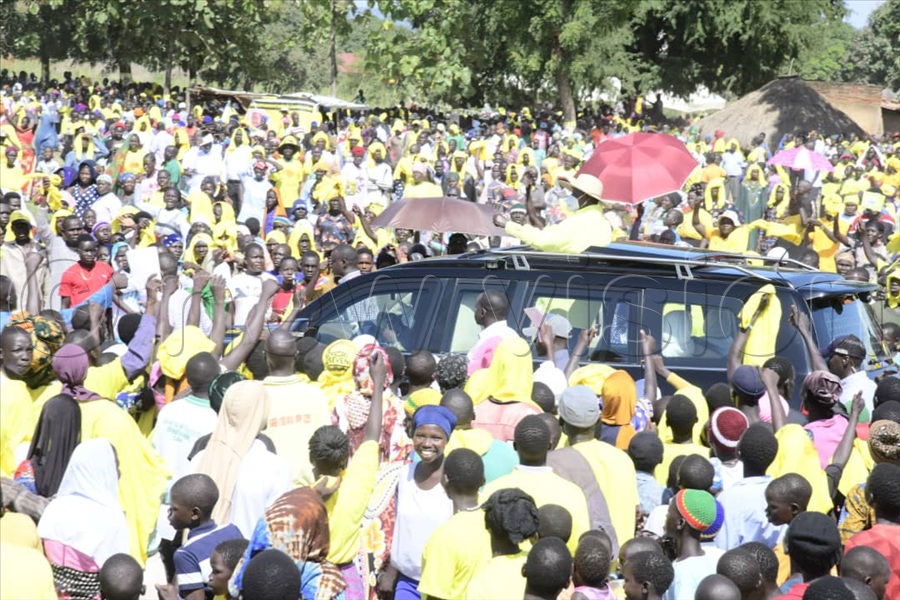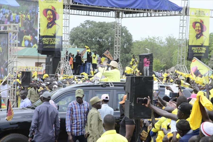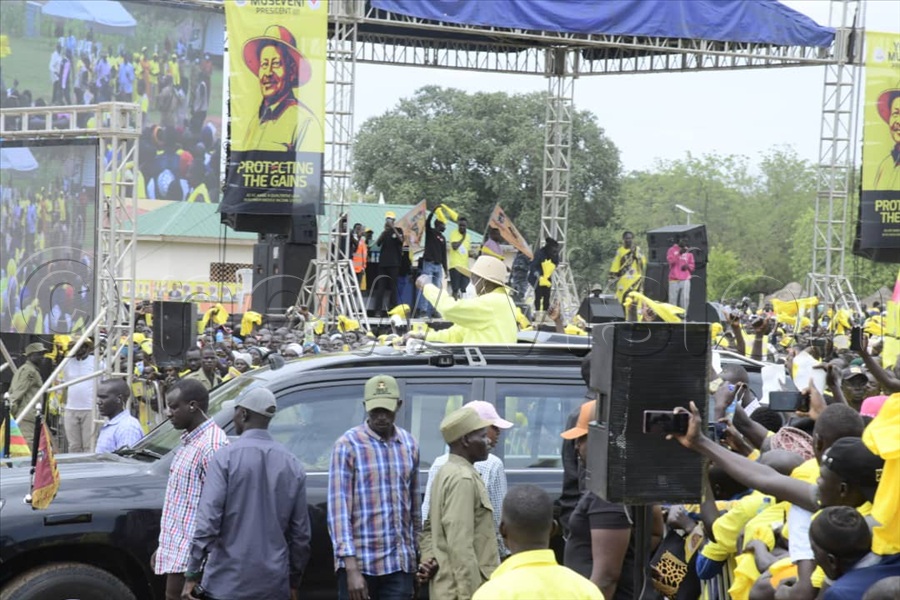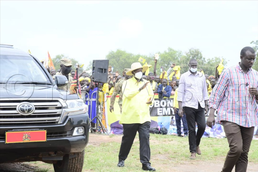 On Friday, October 17, Museveni arrived at Lionga Grounds, Obongi, standing through a car sunroof, flashing a thumbs-up sign and smiling at thousands of his supporters who braved the scorching sun to listen to him.