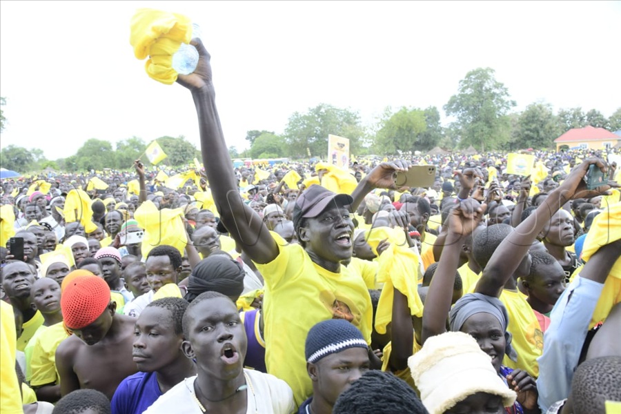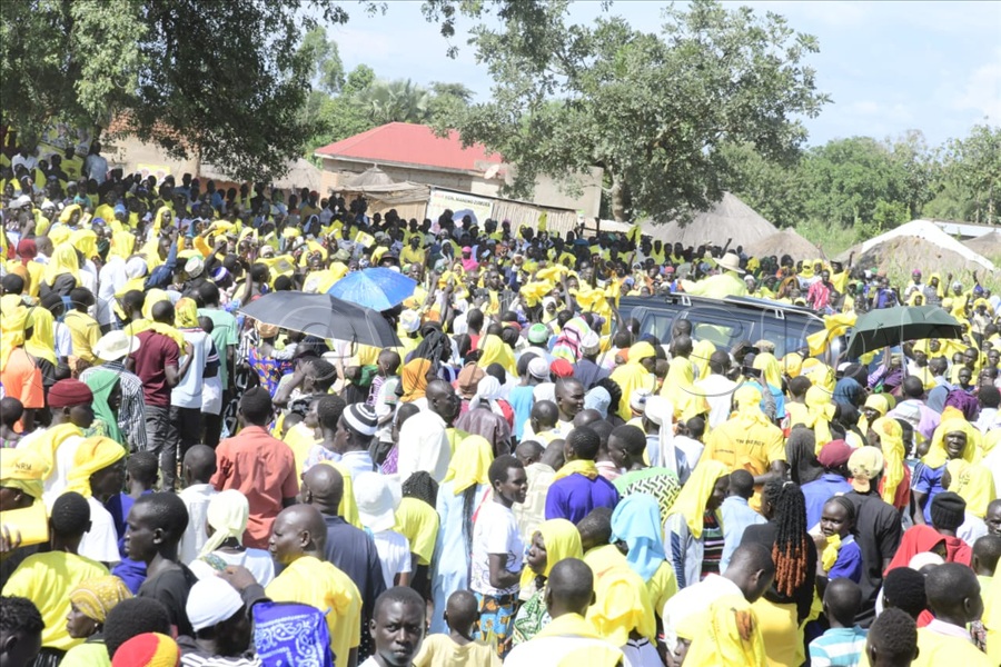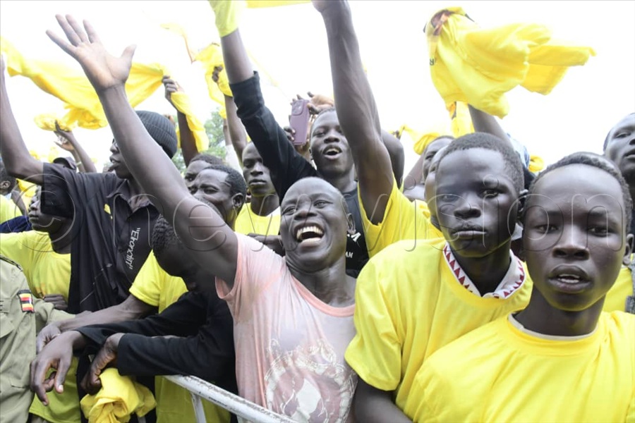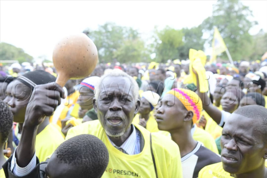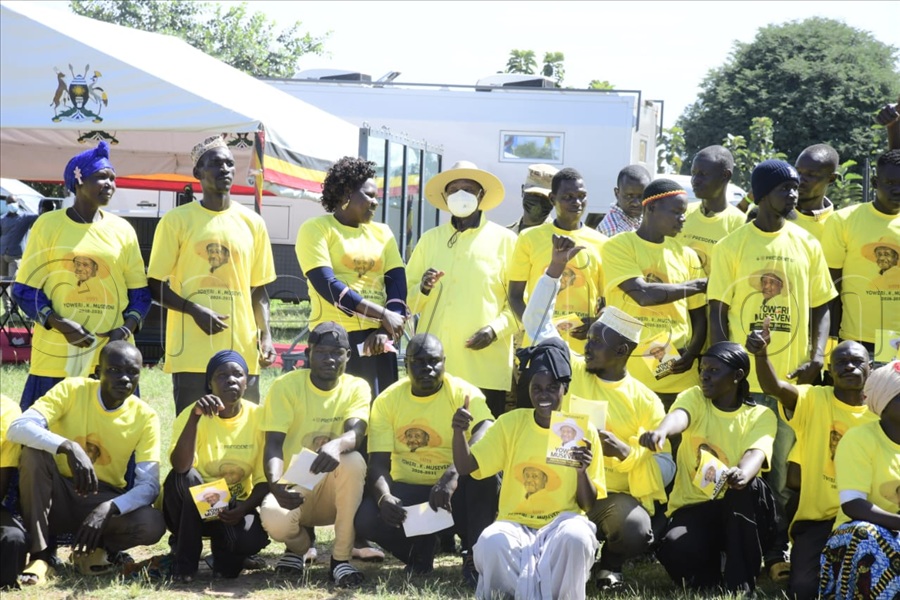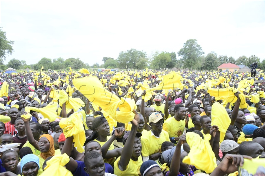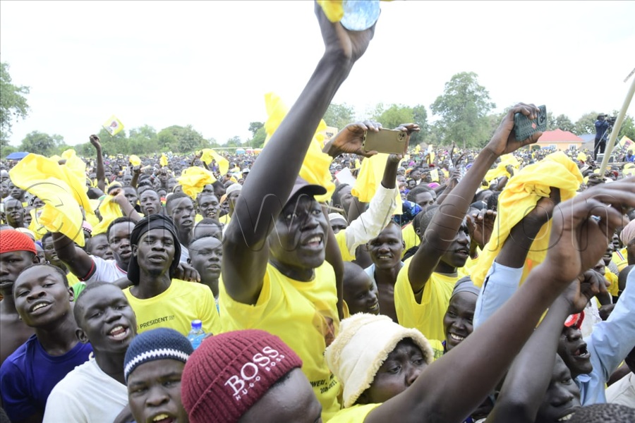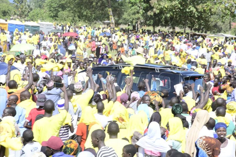 On Friday, October 17, Museveni arrived at Lionga Grounds, Obongi, standing through a car sunroof, flashing a thumbs-up sign and smiling at thousands of his supporters who braved the scorching sun to listen to him.